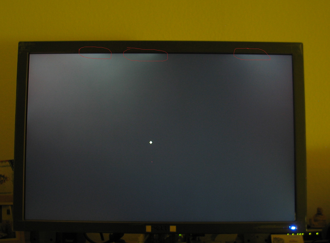 Das Gerät ist TOP, aber beim Auspacken hat mich eins irritiert: das analoge Kabel war bereits an den Bildschirm angeschlossen. Dazu eine Frage an mSh und alle anderen, die den DELL 3008WFP haben: war das bei dir/euch genauso? Und noch eine Frage: wenn ich mit dem DPT (Programm für Pixelfehlersuche) einen schwarzen Hintergrund mache, sieht man im geraden Winkel am oberen Rand 3 helle Stellen, das Bild ist dann nicht einheitlich schwarz (siehe Bild, markierte Stellen). Ist das bei dir / euch auch so?Ansonsten wie schon geschrieben ein supigeiles Teil nur das “aber“….