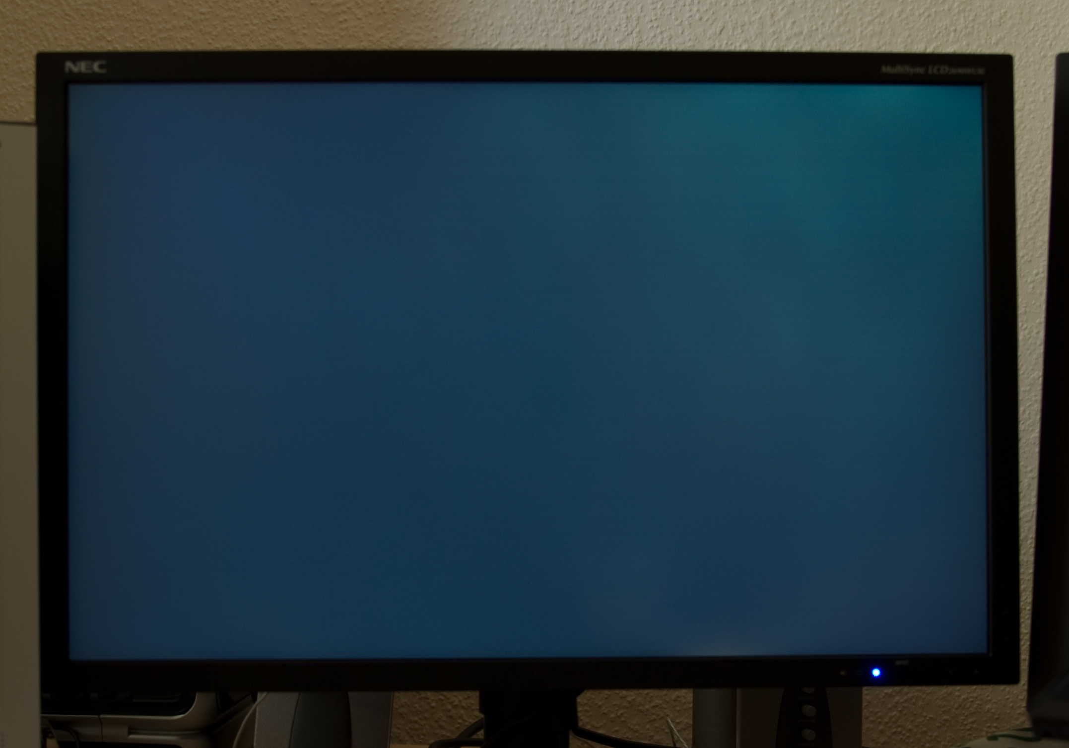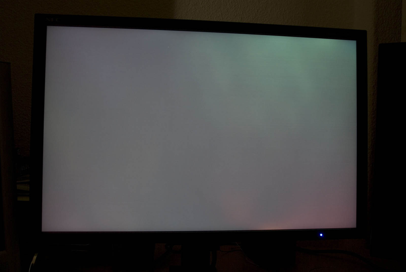 Erstens ist das dargestellte Bild, während man am Monitor arbeitet, nie vollkommen schwarz. Sobald ein Fenster auf dem Bildschirm ist (also nicht nur in der untersten linken Ecke, sondern sagen wir mal 'mittig'), wirst Du den Effekt bereits nicht mehr warhnehmen können. Höchstwahrscheinlich ist es ein Interferenzeffekt an der Paneloberfläche durch das Backlight, was ja nunmal schwach (ca 0,3cd/m²) durch das Panel strahlt.