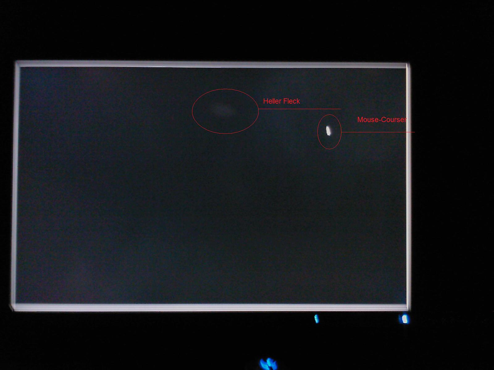 1. Bei dunklen Lichtverhältnissen und schwarzem Hintergrund zeichnet sich ein ziemlich heller daumenvörmiger Fleck ab, der sich leider nicht wegwischen lässt. Dazu kommt, dass bei absoluter Dunkelheit im Raum und schwarzen Hintergrund ein Flimmern und auch eine vertikale Linie im Bereich des Punktes zu erkennen ist. Diese konnte ich allerdings nicht fotographieren.