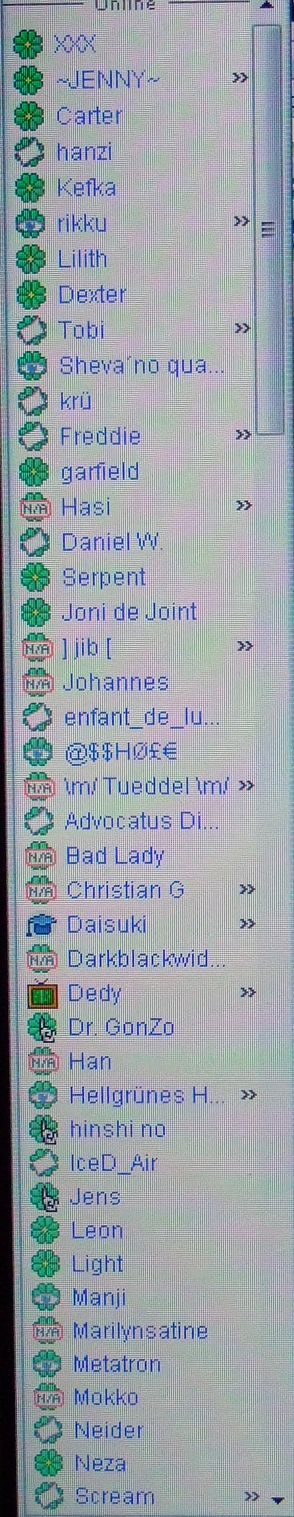 Ein Foto, auf dem das Problem recht deutlich wird, habe ich angehängt - zu sehen: Meine ICQ-Liste. Wenn man die "Blumen" ganz oben und ganz unten vergleicht, ist das doch ein recht krasser Unterschied. Am Blickwinkel auf den Bildschirm liegt es nicht, die Kamera habe ich mittig davorgehalten und ich sitze auch mittig, in angemessener Entfernung.