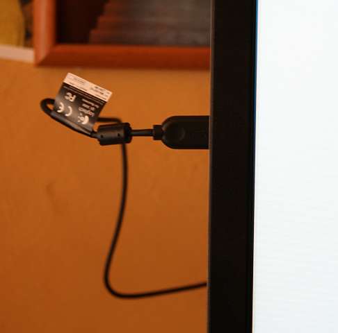 UPDATE: Auf der Rückseite befinden sich nochmal zwei USB Anschlüsse, die für einen verdeckten Anschluss geeignet sind. Der Kritikpunkt hat sich also erledigt. Diese fanden in der mitgelieferten Anschlussanleitung keine Erwähnung.