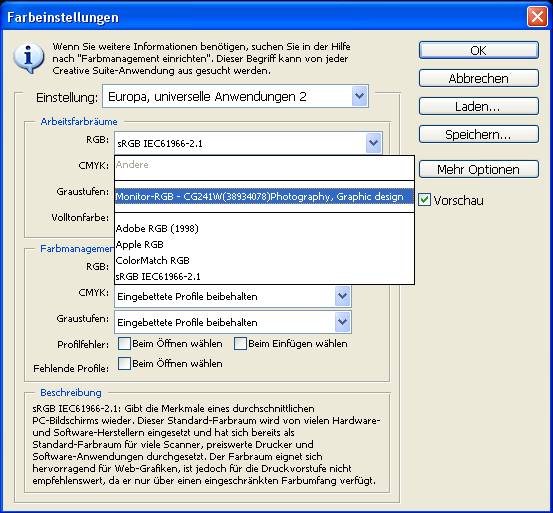 Also Irfanview und die CS2-Vorschau zeigen mehr Farben nach Umwandlung zu SRGB als ich bei der Bearbeitung in Photoshop einstelle bzw. sehe.
