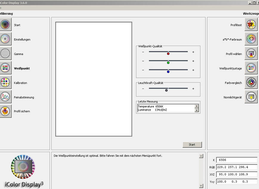 Steuere hier über das OSD die Helligkeit und den Weißpunkt über x und y Werte bis die "Letzte Messung" den Werten bei den Einstellungen entspricht (6500 und 135 cd/m2)Kalibration