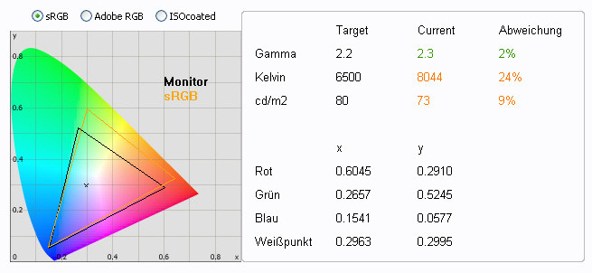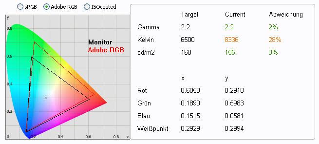 - Die auswählbaren, werksseitig voreingestellten Farbraumbegrenzungen (sRGB und AdobeRGB) sind ebenfalls sehr akkurat.