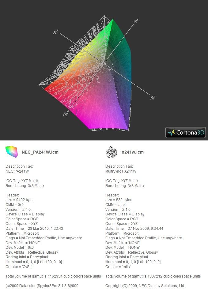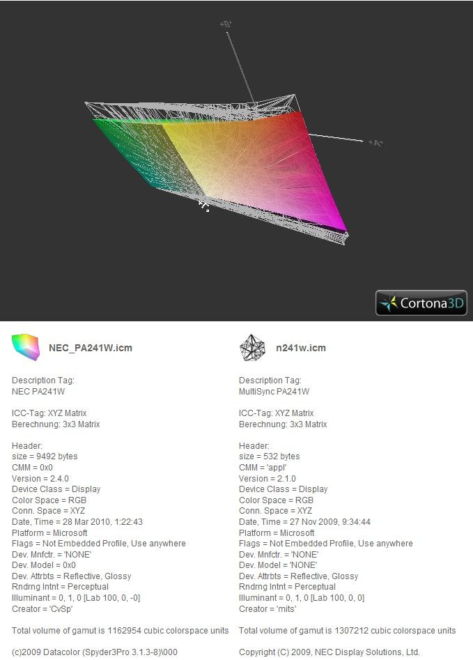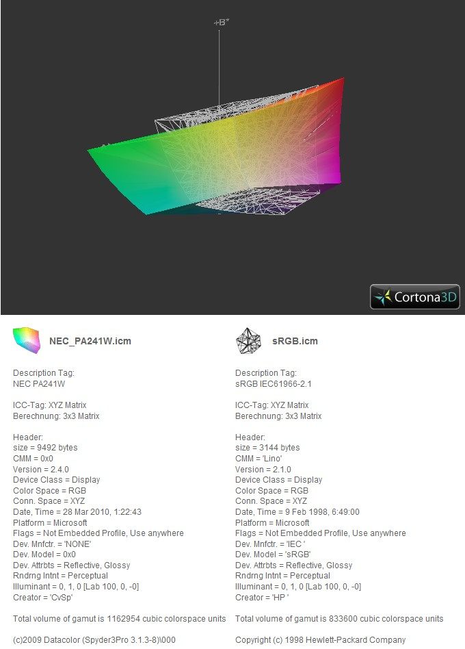 Das erzeugte Farbprofil hat einen viel kleineren Farbraum, als das generische Profil, welches von NEC auf CD mitgeliefert wurde. Es deckt auch den AdobeRGB-Farbraum und nicht einmal den sRGB-Farbraum ab. Dies wiederspricht eigentlich meinem subjektiven Eindruck, denn der Monitor zeigt wirklich extrem kräftige Farben, kein Vergleich mit meinem Alten.