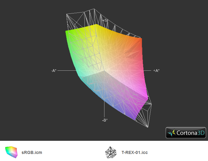 Hier ist deutlich zu sehen das mein Monitorfarbraum im Gelb-Grün Bereich und im Magenta-Bereich einen deutlich grösseren Farbraum als SRGB hat.