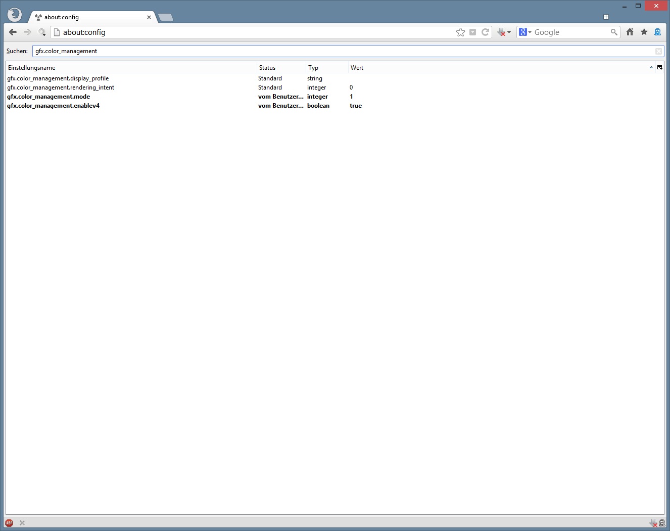 Wenn wir aber gerade mal schreiben, evtl. kannst du mir auch bei einem anderen Problem behilflich sein. Ich nutze bisher immer 2 Monitore, einen billigen und einen zur Bildbearbeitung mit erweitertem Farbraum. Nun besteht ja das Problem, dass Windows auf sRGB basiert und Wide Gamut Monitore Farben viel zu gesättigt anzeigen (u.a. deshalb nutze ich immer 2, möchte jetzt aber auf einen umsteigen). Besonders auffällig ist es im Browser, da dort betrachtete Bilder immer "zu bunt" sind. Nun verwende ich Firefox und dort gibt es im about:config Dialog die Einstellung gfx.color_management. Leider bringt diese bei mir keine Veränderungen, egal was ich einstelle (den Neustart jetzt nicht vergessen). Egal ob mit 0,1 oder 2, die Bilder sind immer gleich übersättigt. Und gfx.color_management.enabled ist auf "true", ja.
