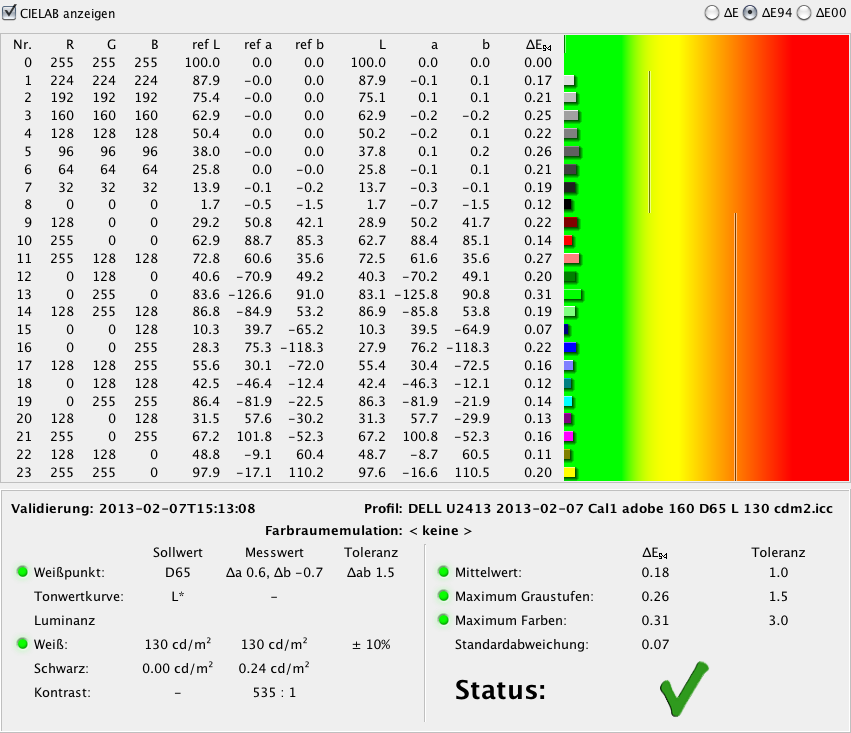 Mit Basiccolor habe ich den 2413 dann für meine Einstellungen kalibriert (L*, D65, 130cd). Die besten Ergebnisse erhielt ich bisher, wenn ich vorher unter Windows "AdobeRGB", "Gamma 2,2" und "160cd" kalibriert habe. Dann ist das Ergebnis schon recht anständig.