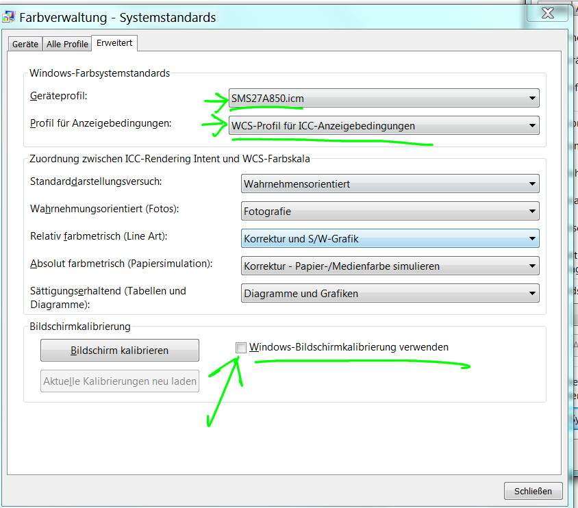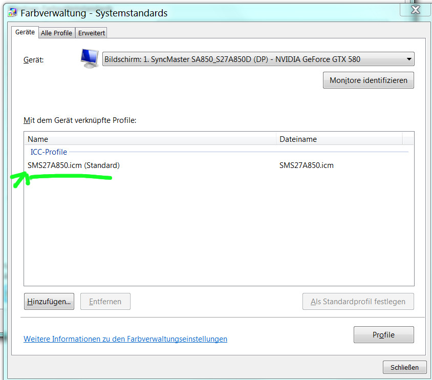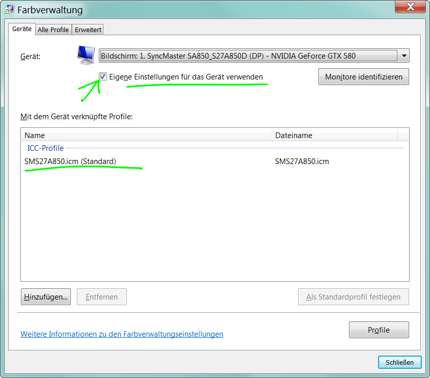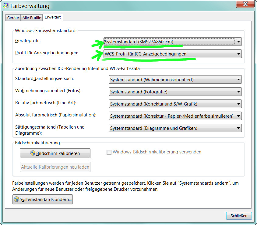 Mein leider nur sRGB-fähiger Monitor (S27A850D von Samsung) ist mit dem i1 display pro kalibriert. Monitorprofil ist in der Windows Farbverwaltung hinterlegt und als Standard-Profil eingestellt.