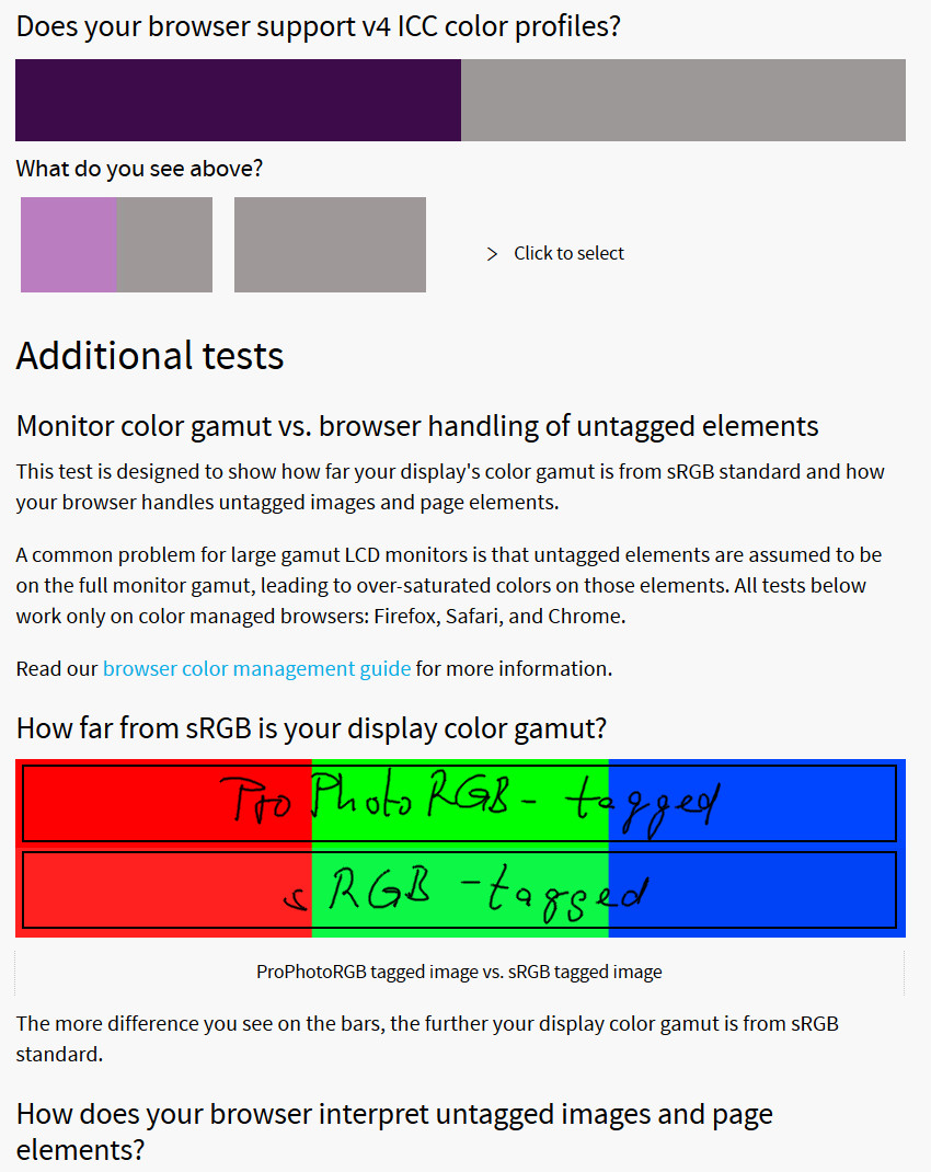 Auch werden die Violett-Töne oben auf der Seite unterhalb der Frage "Does your browser support ICC v4 color profiles?" verschieden bei mir angezeigt.