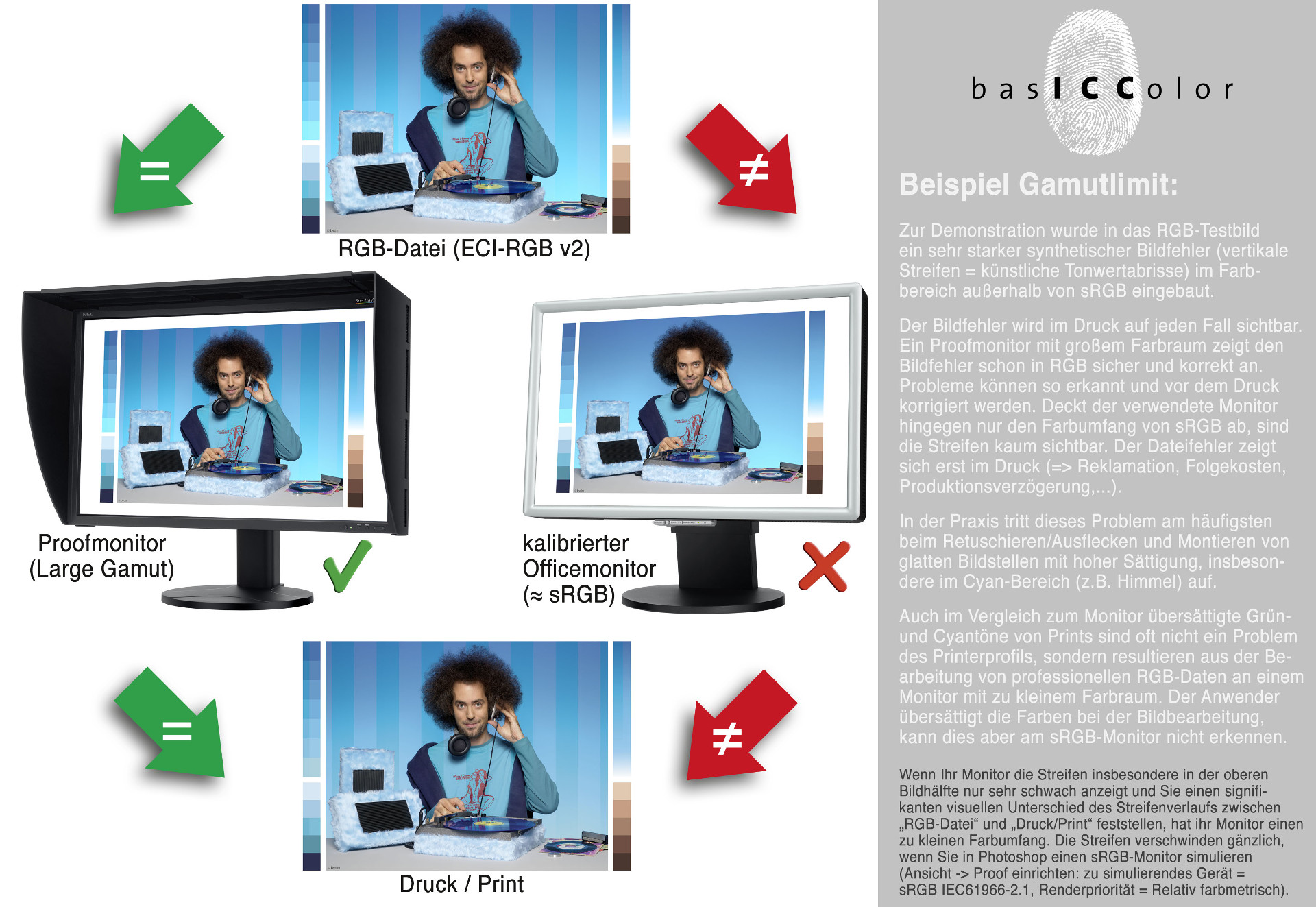 Öffne ich auf dieser Seite im Abschnitt b) (Gamuttest) das 'Gamutlimit-Testbild (2,5 MB)', sehe ich in keinem der drei Bilder die beschriebenen Streifen.