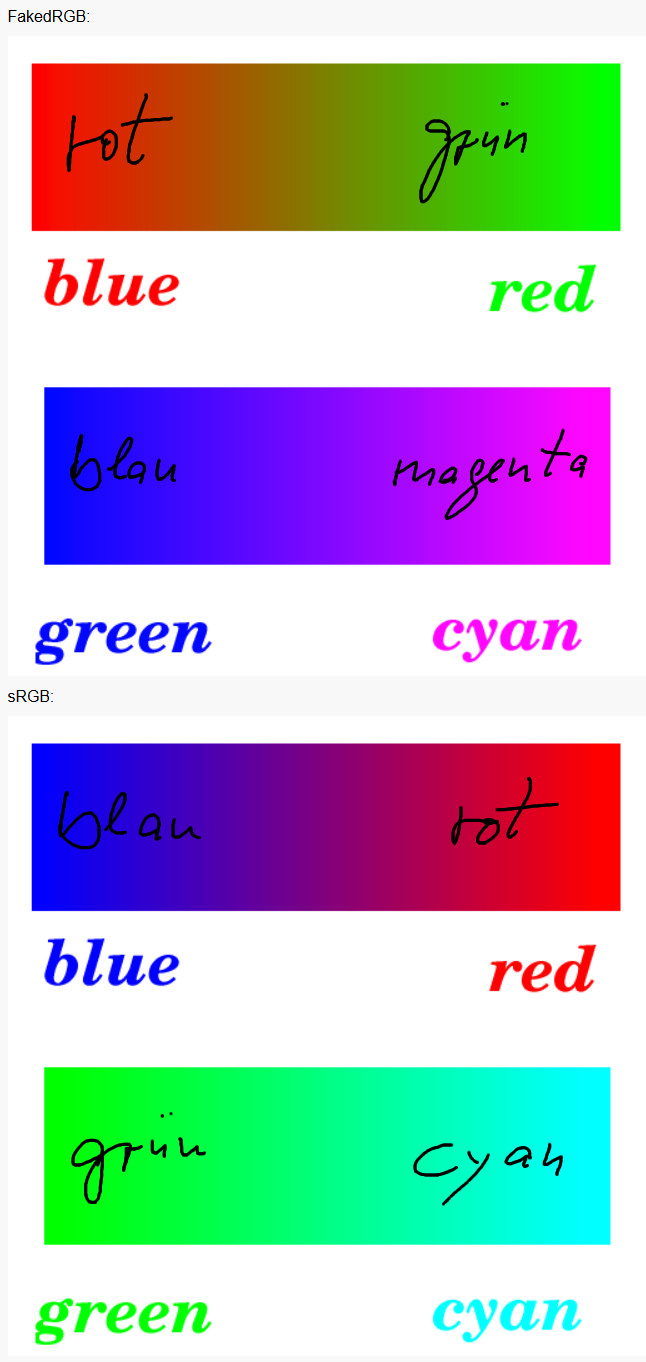 Der obere Rot-/Grün-/Blau-Balken mit den ProPhotoRGB-getaggten Bildern sieht in meinem Browser anders aus als der untere Rot-/Grün-/Blau-Balken mit den sRGB-getaggten Bildern.
