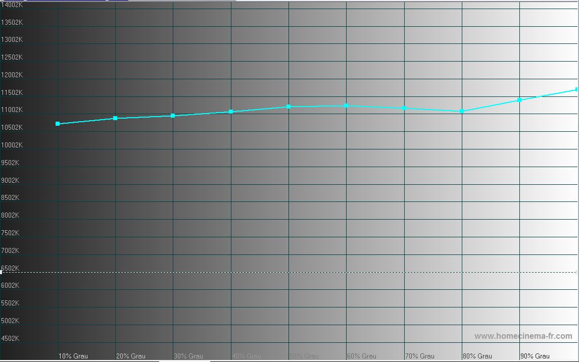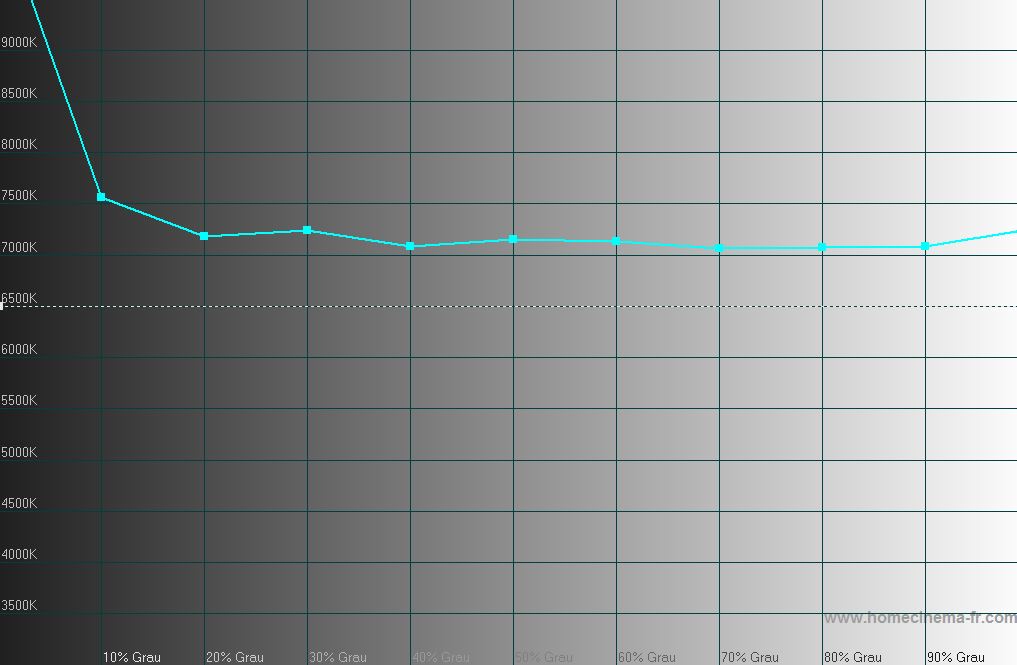Die Farbtemperatur ist noch höher, gut 7500K. Dadurch ist das Bild etwas heller, aber auch "kühler", also stärker blaustichig.