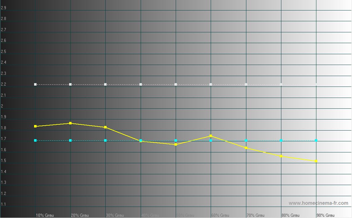 Der Gamma-Wert liegt bei 2.0 und damit etwas unter dem Referenzwert von 2.2, die Wiedergabe wird also etwas kontrastverstärkt. (Gelb sind die Messwerte, hellblau ihr Durschnitt und weiss der Referenzwert)