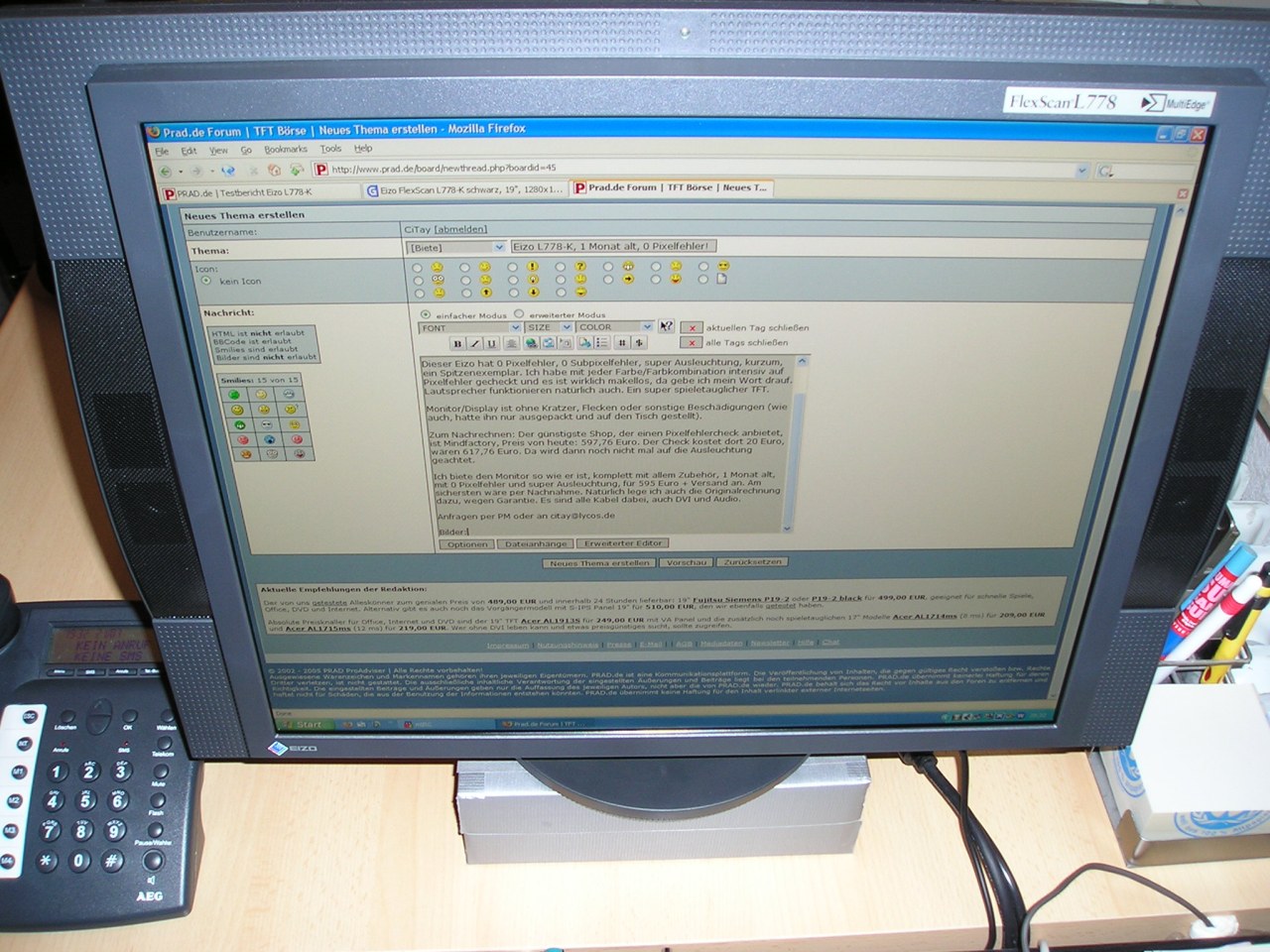 Quatsch, dann hätte ich ihn ja innerhalb der 2 Wochen-Frist zurückgegeben. Von der Bildqualität gibt es momentan nichts besseres. Außerdem hatte ich vorher schon mal einen L778-W, ich wusste ja, dass die gut sind. Ich hatte auch schon den FSC P19-2 hier und drei oder vier 17" TFTs. Die Dinger bleiben bei mir irgendwie nie länger als einen Monat, hehe.
