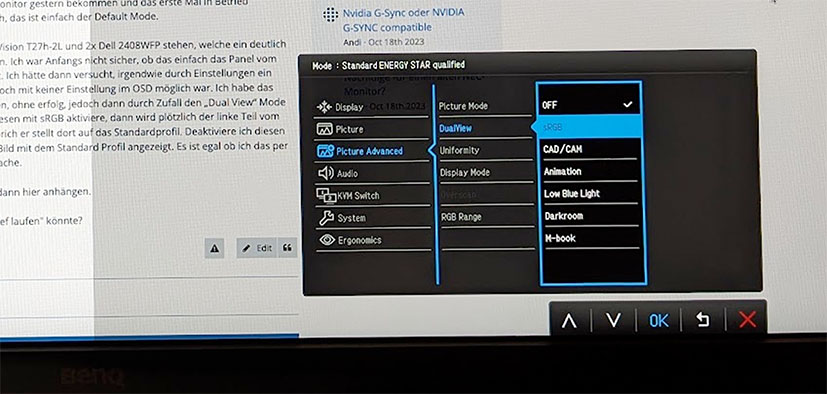 Ich habe nebenbei 2x Lenovo ThinkVision T27h-2L und 2x Dell 2408WFP stehen, welche ein deutlich helleres und gesättigteres Bild haben. Ich war Anfangs nicht sicher, ob das einfach das Panel vom Benq ist, welches einfach dunkler ist. Ich hätte dann versucht, irgendwie durch Einstellungen ein helleres Bild zu bekommen, was jedoch mit keiner Einstellung im OSD möglich war. Ich habe das Standard Profil versucht zu aktivieren, ohne erfolg, jedoch dann durch Zufall den „Dual View“ Mode gefunden und aktiviert. Wenn ich diesen mit sRGB aktiviere, dann wird plötzlich der linke Teil vom Bildschirm heller und gesättigter, sprich er stellt dort auf das Standardprofil. Deaktiviere ich diesen Modus wieder, wird das komplette Bild mit dem Standard Profil angezeigt. Es ist egal ob ich das per SW (Win oder Mac) oder am OSD mache.