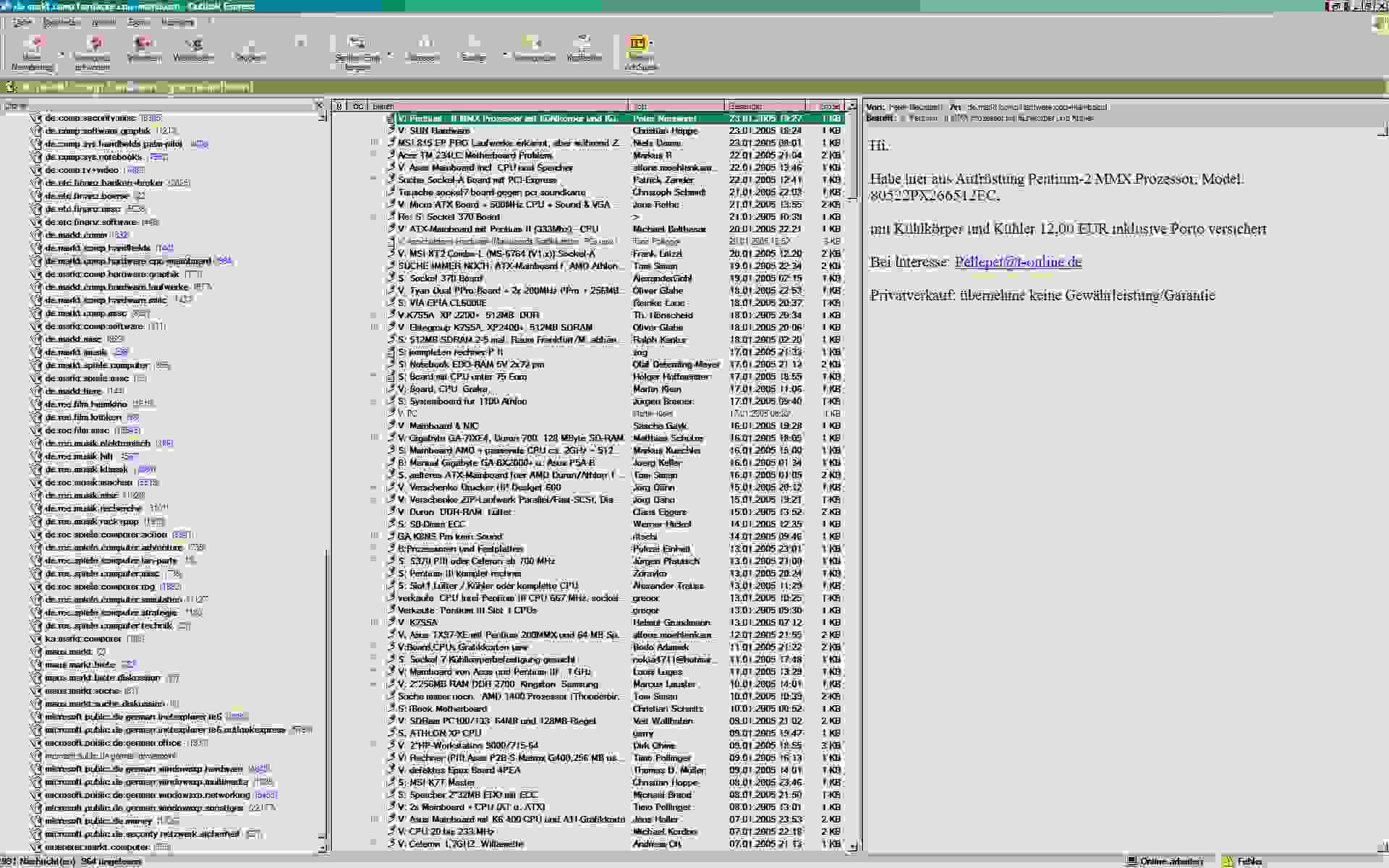 Mtit DVI ist das Bild auch bei Interpolation einwandfrei. Mit D-Sub sieht m,an einige Unschärfen bei der Interpolation. Überhaupt wirkt das Bild nicht so sauber als mit DVI Eingang. Ich nuttze z. .Z. einen AMD 3000 mit NVidia 5900. Die Shrift ist klar zu lesen, für mich auch nicht zu klein. Schön ist vor allem, dass mann zwei Internet-Browserfesnter nebeneinander abbilden kann oder eben zwei Excel- Tabellen, etc. Anliegend mal, wie ich in utlook Express die NG's lese. Schön übersichtlich