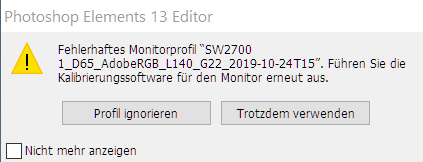 Den Monitor (BenQ W2700) habe ich hierauf erneut hardware-kalibriert mit dem Spyder 5, aber die Fehlermeldung erscheint dennoch bei jedem Start.