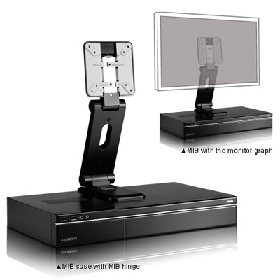 Gigabyte möchte Computerhehäuse noch platzsparender aufstellen und schafft eine Synergie zwischen Monitor und Gehäuse. Bei der neuen MIB-Serie dient das Gehäuse als Standfuß des Monitors, indem der Monitorarm direkt auf dem Gehäuse platziert wurde. Trotz der geringen Gehäusemaße stehen dem Käufer zahlreiche Bestückungsmöglichkeiten offen, die zudem die Aufnahme handelsüblicher Komponenten beinhalten.