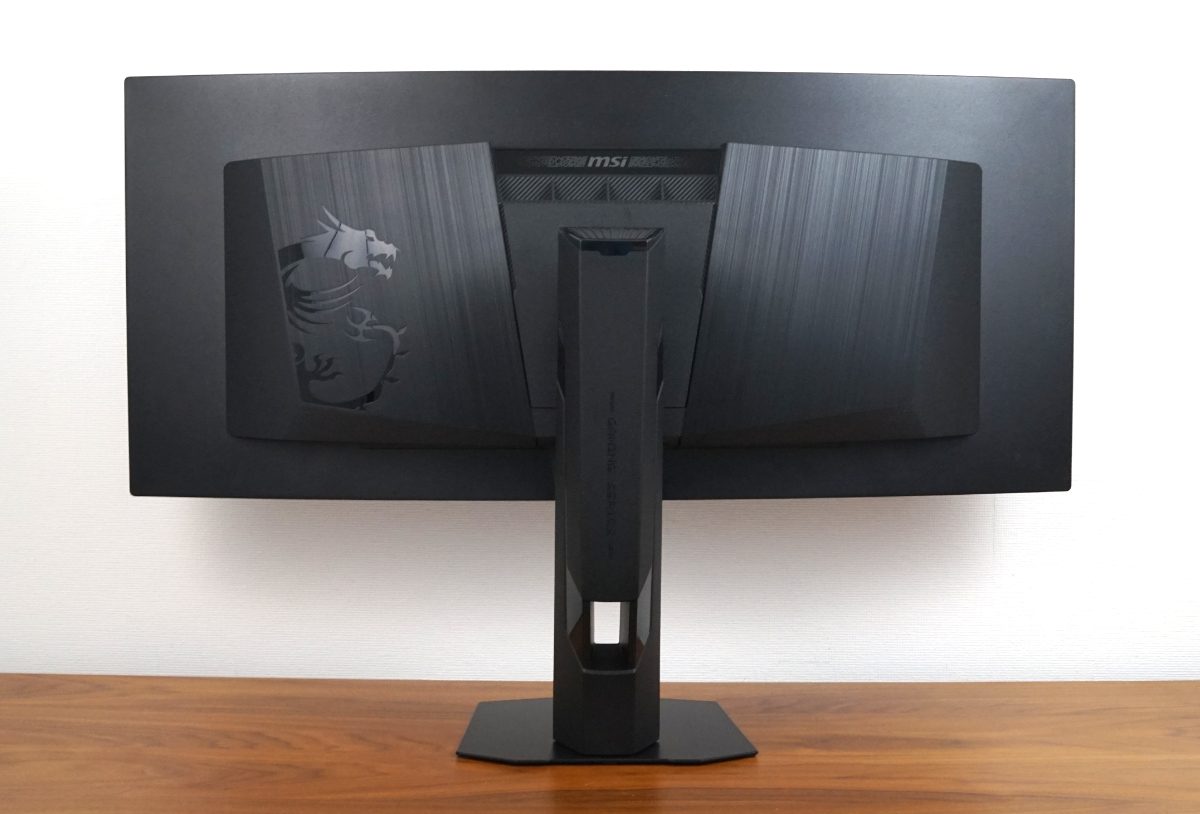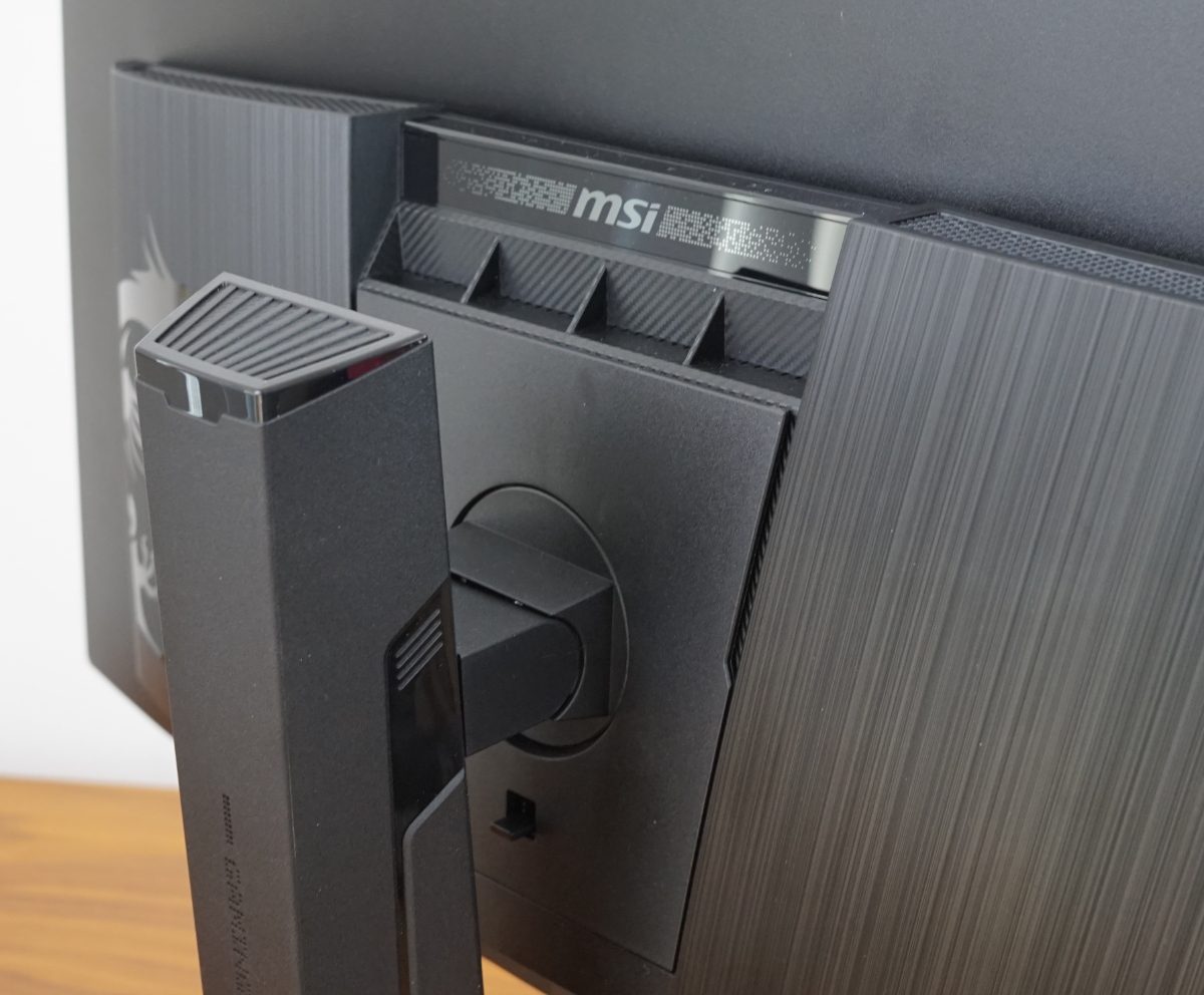 Auf der Rückseite ist der Erker, in dem die Technik untergebracht ist, mit einer Art Metallrelief versehen, und auf einer Seite ziert der MSI-Drache in Hochglanzoptik die Rückseite. Auch der Standfuß besitzt hochglänzende Elemente.
