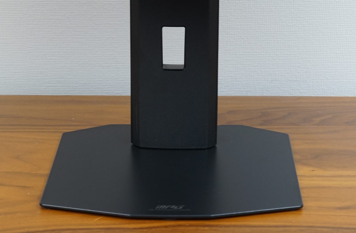 Der Standfuß ist aus Metall und macht einen hochwertigen Eindruck. Trotz der geringen Höhe von nur wenigen Millimetern erfolgt die Montage mit dem Standbein per Flügelschraube, was nicht selbstverständlich ist. Eine Öffnung im Standbein dient dem Kabelmanagement. Beim seitlichen Drehen sollte man den Fuß mit einer Hand fixieren. Das Drehgelenk befindet sich im Fuß, der aber nicht mitdreht.