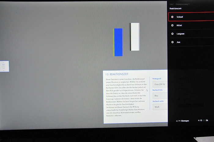 Die Monitortest-Software zeigt im Teil „Reaktionszeit“ gewisse sichtbare Fehler, jedenfalls kann man in diesem Test die Geschwindigkeit zweier sich schnell über den Bildschirm bewegender Balken so einstellen, dass Fehler bzw. Schwächen in der Darstellung sichtbar werden (was aber ab einer gewissen Geschwindigkeit bei jedem Monitor der Fall ist). So rein subjektiv sieht man ja gar nicht irgendwelche Schwächen bzgl. der Reaktionszeit oder ist gar nicht in der Lage, diese überhaupt zu erkennen. Schnelle Szenen in einem Film sind sowieso irgendwie etwas verschwommen und eben schnell, da kann man gar nichts sehen. Und Ballerspiele-Erfahrung habe ich gar keine.