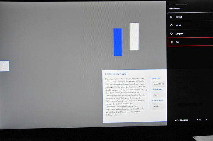 Da ich im Menü eine Einstellung zur Reaktionszeit gesehen hatte, wollte ich an dieser Stelle dann mal die Auswirkungen der verschiedenen Einstellungen prüfen. Man hat deutliche Änderungen im Verhalten durch die verschiedenen Einstellungen sehen können, allerdings zeigte die Einstellung „Schnell“ ein sichtbar schlechteres Bild als „Langsam“ oder „Aus“. Die Auswirkungen im Bild korrelierten also irgendwie nicht mit der Einstellung. Für mich sah es so aus, als ob die Einstellungen irgendwie in falscher Richtung herum beschriftet sind, also als ob „Aus“ in Wirklichkeit „Schnell“ wäre, und umgekehrt. Allerdings habe ich von dem Thema keine Ahnung und denke deswegen, dass ich da falsch liege. Wie auch immer: Ich konnte feststellen, dass „Langsam“ für mich am besten aussieht.