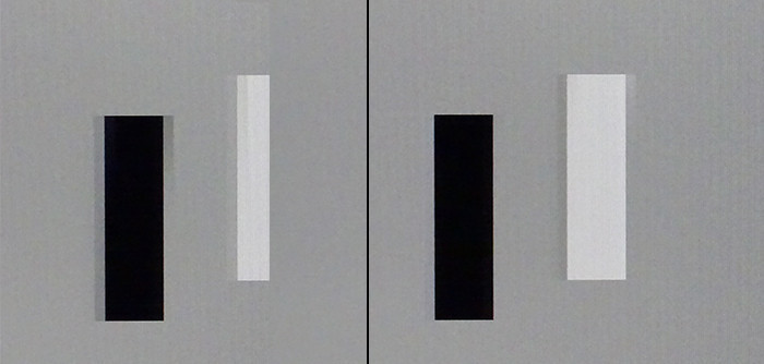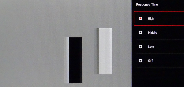 Ohne Optimierung der „Response Time“ sieht man leichte Schlieren, welche bei der Einstellung „Mittel“ stark nachlassen (Mitte). Mit der Einstellung „Hoch“ sind starke Artefakte sichtbar