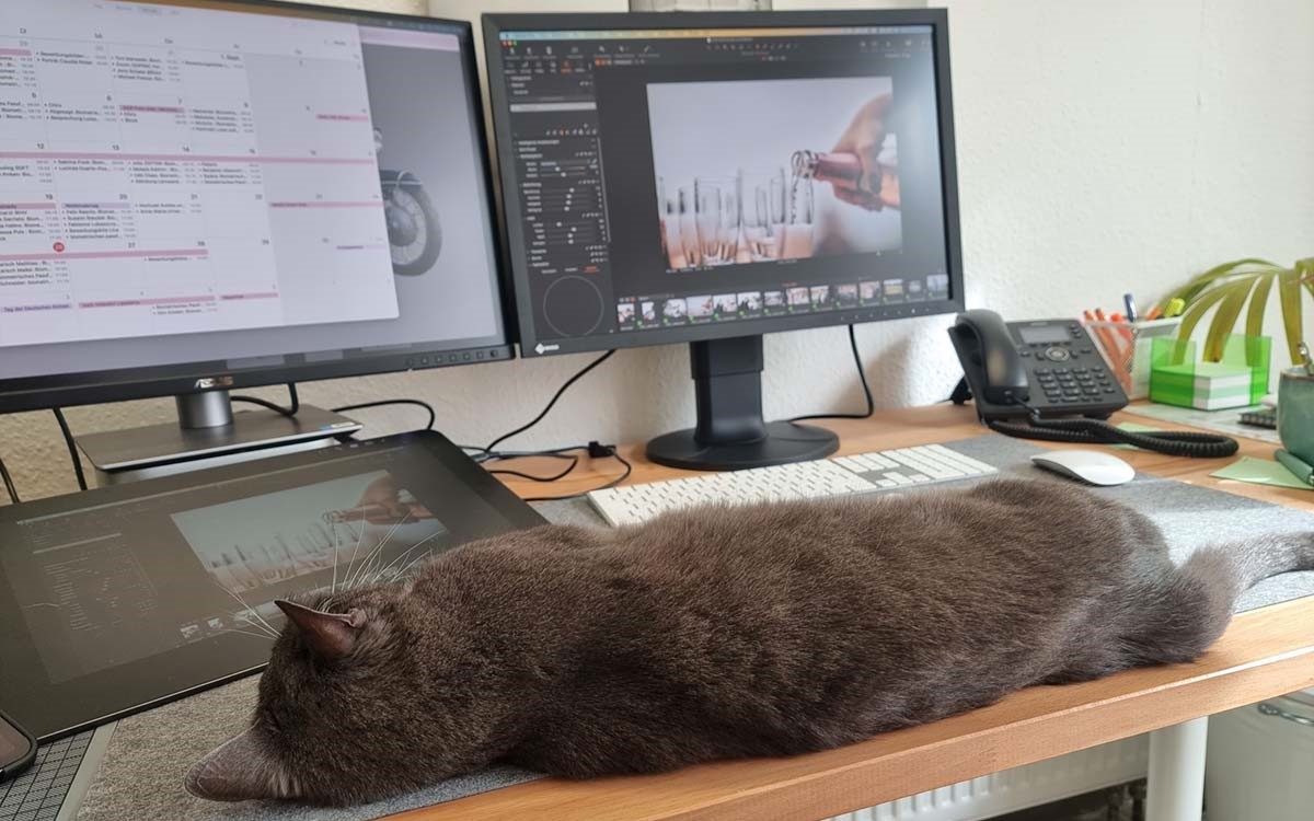 Ich freue mich, berichten zu können, dass keine Pixelfehler auf dem EIZO CS2400S gefunden wurden. Das Bild ist makellos und frei von störenden Fehlern. Mein vierbeiniger Mitarbeiter Django bestand aber darauf, noch mal selber zu prüfen. Danach durfte natürlich weitergearbeitet werden. Na ja, ich zumindest.