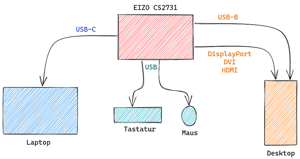 Besonders attraktiv ist das, wenn der Monitor auch noch an einen Desktop-PC angeschlossen ist. In dieser Konstellation kann durch Umschalten der Signalquelle am Monitor zwischen den beiden Rechnern gewechselt werden. Im Prinzip sieht das so aus: