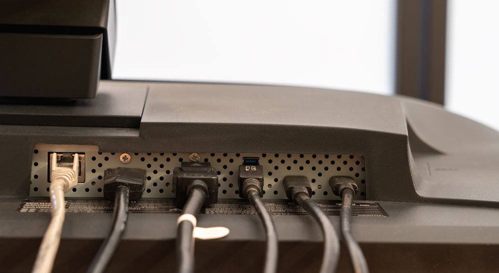 Die Konnektivität des EV2795 ist umfangreich. Neben je einem HDMI-Anschluss und DisplayPort stehen zwei USB-C-Schnittstellen (einer für Daisy-Chain), drei USB-A-Downstream-Ports und ein USB-Upstream-Port für die Funktionalität des KVM-Switches zur Verfügung. Außerdem sind eine Klinke für Audiosignale und eine RJ-45-Buchse für LAN vorhanden.