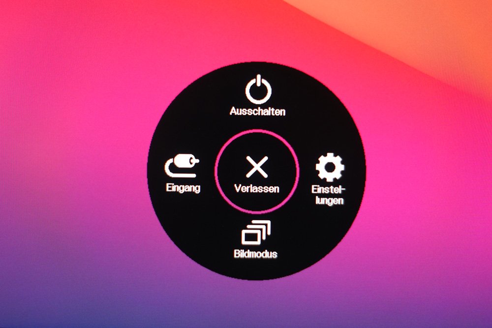 In der Mitte unter dem Monitorlogo angeordnet findet ihr einen Joystick/Knopf, der euch durch das Menü des Displays lotst. Ein kurzer Druck auf besagten Joystick, und das On-Screen-Display wird sichtbar. An sich sollte man meinen: nichts Besonderes. Aber genau in dem Moment fällt mir ein, dass ich bis dato wirklich selten Monitormenüs unter den Fingern hatte, die simpel, einfach und intuitiv zu bedienen sind. Mutig draufgedrückt, erschließt sich alles auf den ersten Blick.