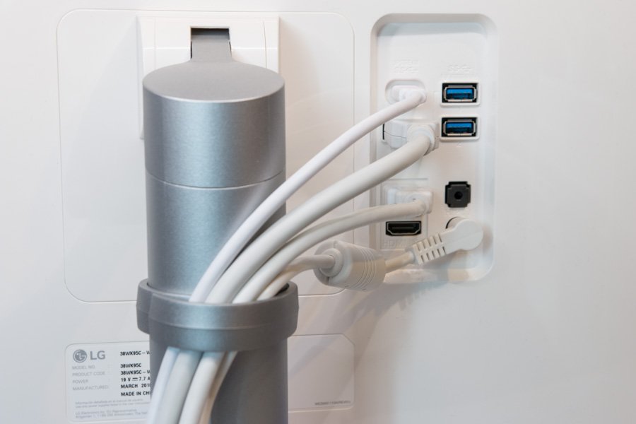 Bei den Anschlüssen bietet der Monitor alle derzeit aktuellen Standards. Nico Gessner kommentiert dies folgendermaßen: „Zentral auf der Rückseite und ohne unnötig lange Kabelwege zum Monitorhalter sind die Anschlüsse untergebracht. Mit einem DisplayPort 1.2, zweimal HDMI 2.0 und vor allem dem USB-C sollte sich alles, was aktuell auf dem Markt zu finden ist, anschließen lassen. Als perfekte Ergänzung zum Anschluss der nötigen Peripherie gibt es noch je zwei USB-2.0- und USB-3.0-Ports. Abgerundet wird das Angebot mit einem Audio-out durch eine 3,5-mm-Klinke. Sehr schön finde ich dabei auch gleich die funktionelle Kabelführung am Halter. Gerade bei einem so schön aufgeräumten Design wären Kabel, die durch die Gegend fliegen, schon sehr unschön.“