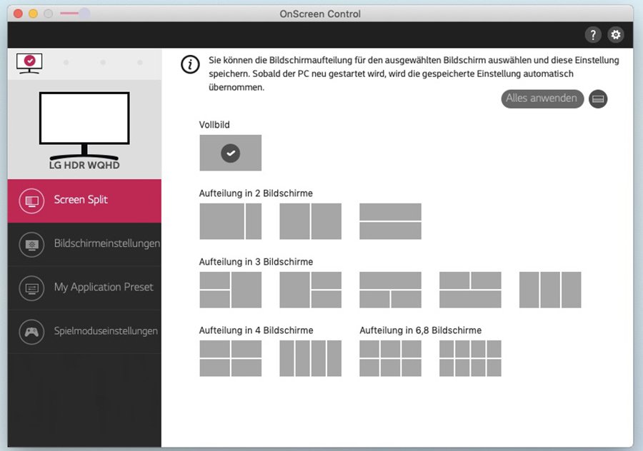 Dabei ist auch gleich ein sehr interessantes Feature gefunden und genutzt worden: der Screen Split. Wer mehrere verschiedene Fenster ständig im Blick haben muss, kennt zur Genüge das Fensterpositionieren. Mal mit kleinen Helfern via Software, oft mit ständigem Fenstergeschubse. LG hat da ein sehr cooles und nützliches Feature geschaffen, mit dem man den Monitor in ein auswählbares, festes Raster einteilt. Jedes Feld in diesem Raster kann dann fast wie ein eigenes Display benutzt werden. Einfach das Programm draufziehen und maximieren, fertig. Als Usability-Hilfe wird dabei ein Feld, wenn es betreten/aktiv wird, sogar noch rot umrandet.