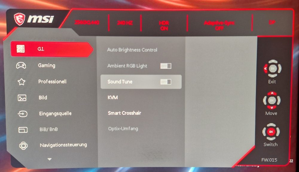 Es gibt folgende Menüpunkte im OSD: Unter „G.I.“ lassen sich MSI-Features wie Ambient RGB Light, Sound Tune, Smart Crosshair oder „Optix Umfang“ einstellen. Unter „Gaming“ ist es beispielsweise möglich, den Spielmodus für voreingestellte Farbprofile (etwa „Premium Color“, „Nutzer“, „Ego-Shooter“ oder „Rennen“) einzustellen, um für das jeweilige Game das beste Farbschema zu erzielen.