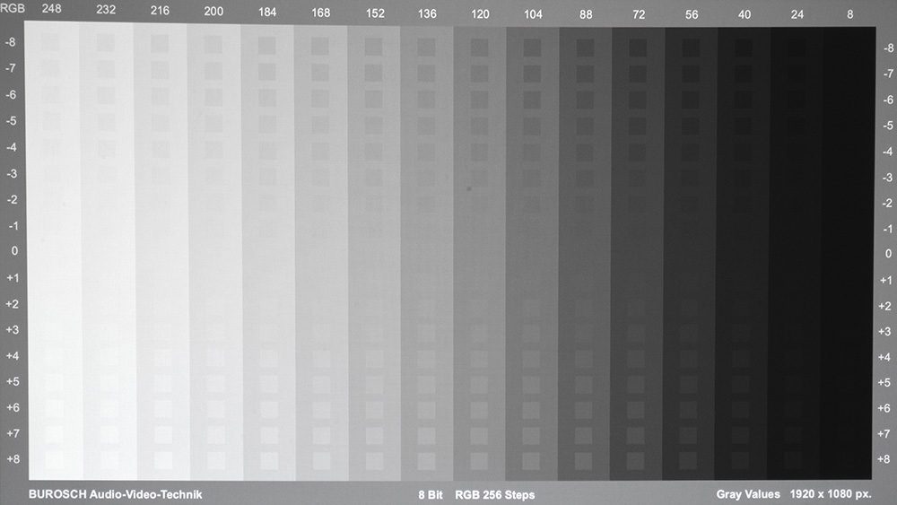 Alle 256 Graustufen eines jpg-Testbildes werden dargestellt. Der für HDTV‑Filme relevante Wertebereich 16 (Schwarz) bis 235 (Weiß) wird von unserem Testgerät vollständig reproduziert. Es laufen keine Inhalte im Schwarz zu, und es überstrahlt nichts ins Weiß. Allerdings haben wir das Schwarz schon deutlich dunkler gesehen.