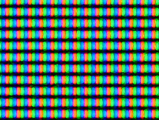 Mikroskopischer Blick auf die Subpixel, mit Fokus auf die Bildschirmoberfläche: Der ASUS PA279CRV besitzt eine matte Oberfläche mit mikroskopisch sichtbaren Vertiefungen zur Diffusion.