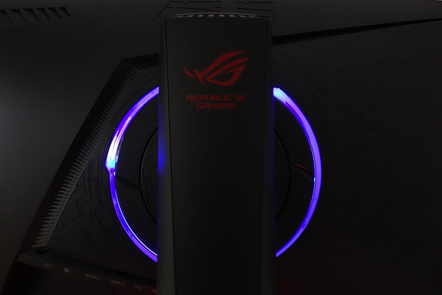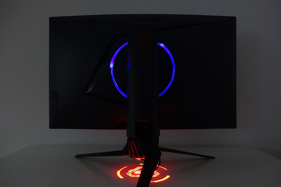 Cool sind die rillenförmige Struktur auf der Gehäuserückseite und der dreibeinige Standfuß mit roten Akzenten. Die Aura-Sync-Beleuchtung ist beim ASUS XG27WQ nun als Ring umgesetzt worden. Das ROG-Logo findet sich einmal auf dem vorderen Gehäuserahmen mittig platziert und ein weiteres Mal auf der Standfußrückseite.