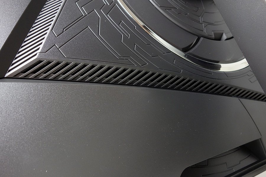 Auf der Gehäuserückseite des ASUS XG27WQ befinden sich ein paar Belüftungsöffnungen. Diese sind perfekt in das Design integriert, aber nach unten hin geöffnet. Das hat zwar den Vorteil, dass Staub und Schmutz nur sehr schwierig ins Gehäuseinnere gelangen kann, doch da Wärme aufsteigt, ist die Positionierung der Belüftungsöffnungen nicht sinnvoll gewählt. Auf der anderen Seite produziert die LED-Hintergrundbeleuchtung so gut wie keine Abwärme, und durch das externe Netzteil sind auch die Spannungswandler außerhalb des Bildschirmgehäuses platziert.