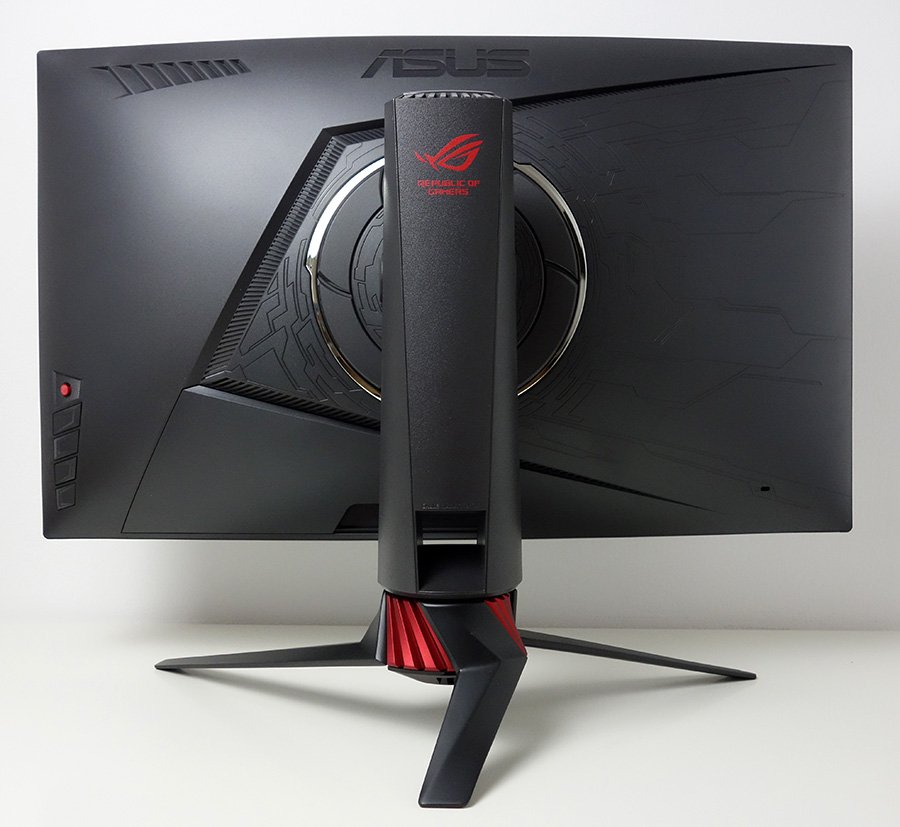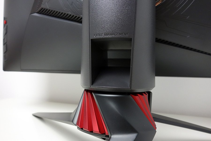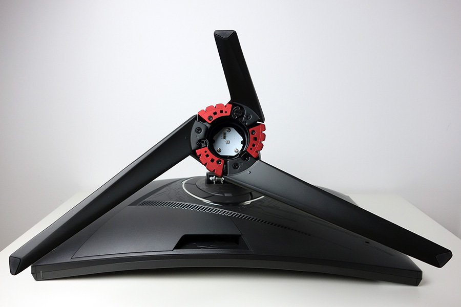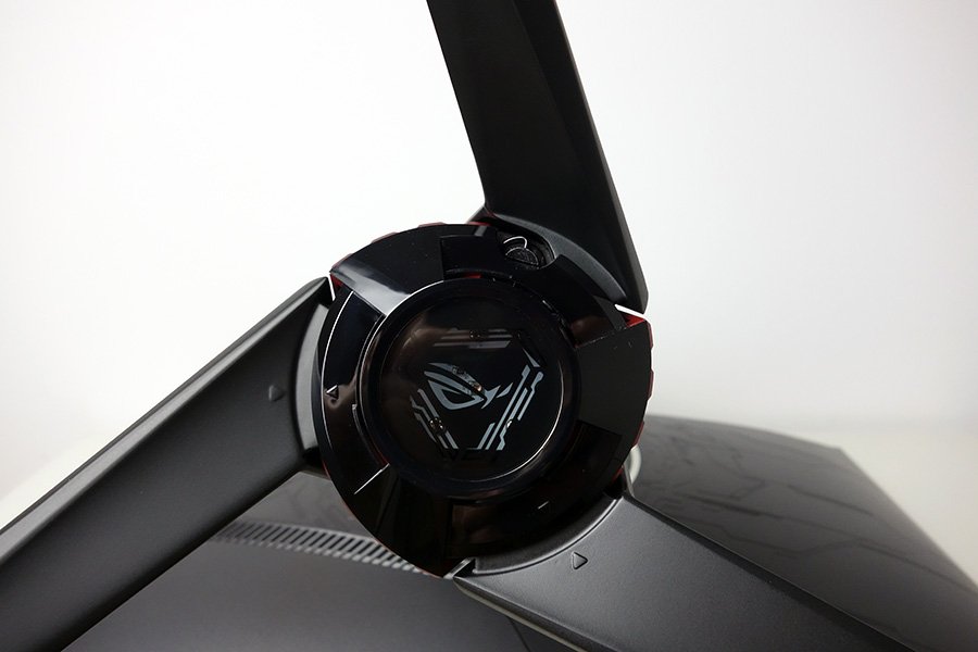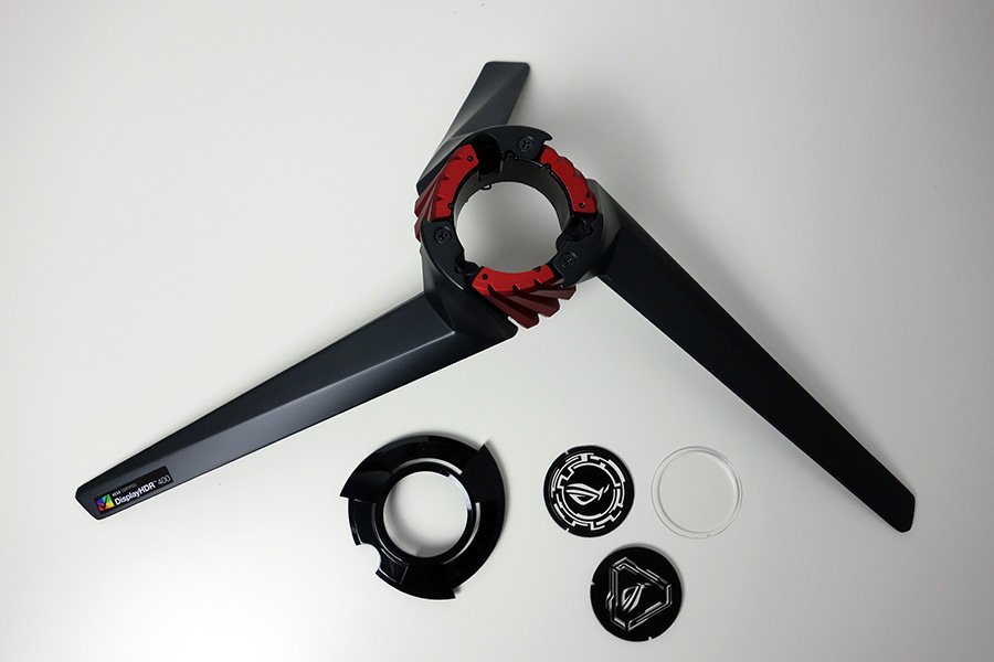 Ein Erkennungsmerkmal der ROG-Strix-Reihe ist der dreibeinige Standfuß. Dieser ist vollständig aus Metall gefertigt und hochwertig verarbeitet. Die roten Akzente sind ebenfalls aus Metall und ahmen die Form einer Turbine nach. Der Standfuß ist nicht vormontiert, durch Aufstecken auf das Verbindungsstück und Fixieren mit einer Flügelschraube ist dieser aber schnell und werkzeuglos montiert.