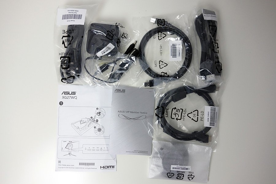 Beim Zubehör hat ASUS nicht gespart und legt dem Monitor ein Kabel für DisplayPort, HDMI und USB 3.0 bei. Das externe Netzteil ist ebenso dabei wie drei Beleuchtungsschablonen für „Light in Motion“, eine Garantiekarte, eine Kurzanleitung und ein Kalibrierungsbericht.