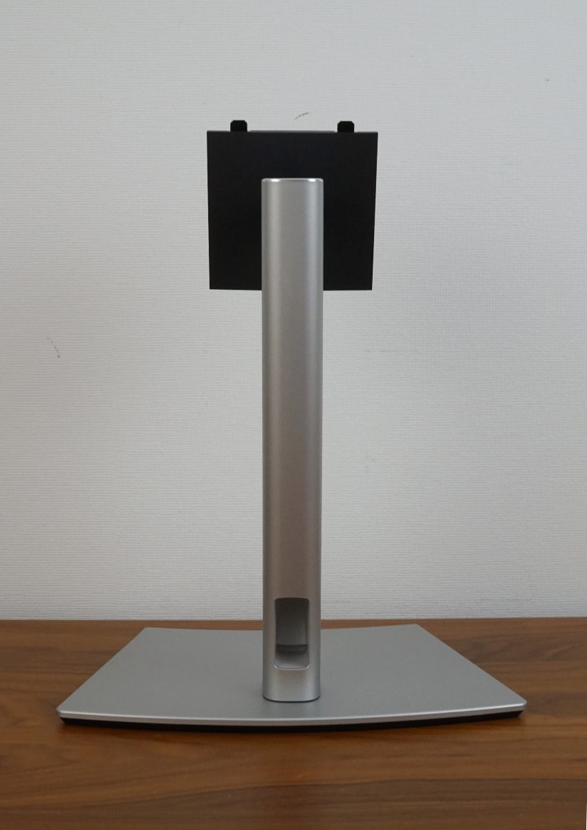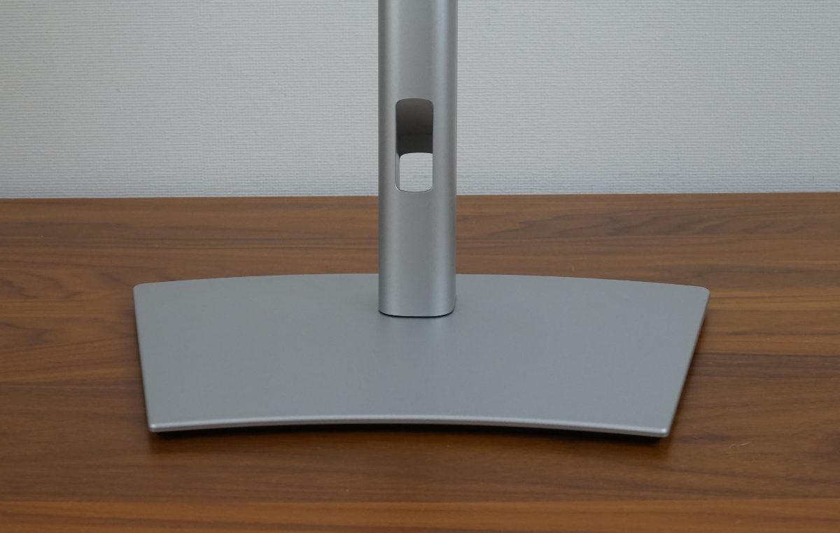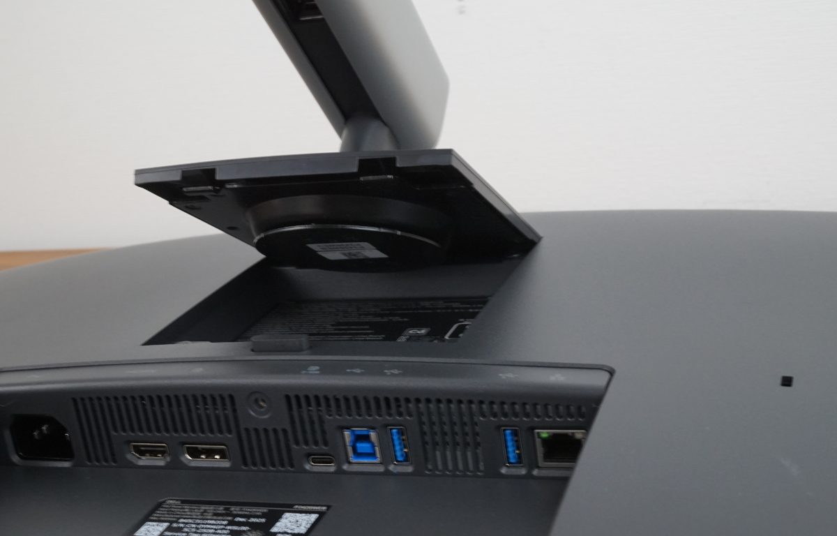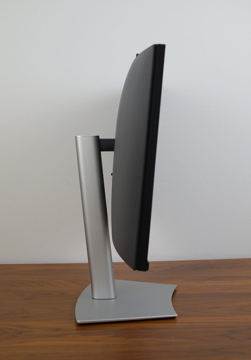Ergonomisch bietet der Standfuß Funktionen wie eine seitliche Drehfunktion, eine Höhenverstellung und eine Neigefunktion. Eine vertikale Drehung (Pivot) ist aufgrund der Krümmung nicht vorgesehen und wäre auch nicht sinnvoll. Damit die Kabel nicht lose herunterhängen, hat das Standbein eine Öffnung, die jedoch vorn und hinten versetzt ist. Die Kabel im hinteren Bereich weiter unten zu bündeln, ist eine an sich gute Idee, aber der Platz ist dadurch begrenzt. Man sollte das Stromkabel also zuerst durchführen.