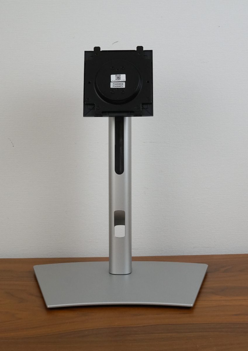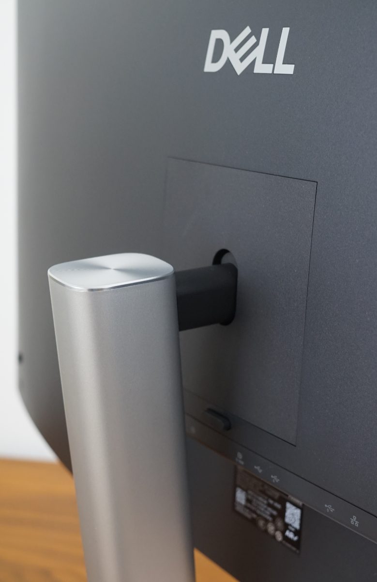 Das Standbein wird dann in die dafür vorgesehene Öffnung auf der Rückseite des Dell P3426WEB eingeschoben und nach unten gedrückt, bis es einrastet. Ein Druck auf den Schalter löst die Arretierung wieder. An dieser Stelle befinden sich auch die vier Schrauben, mit denen alternative VESA-100-Halterungen montiert werden können.