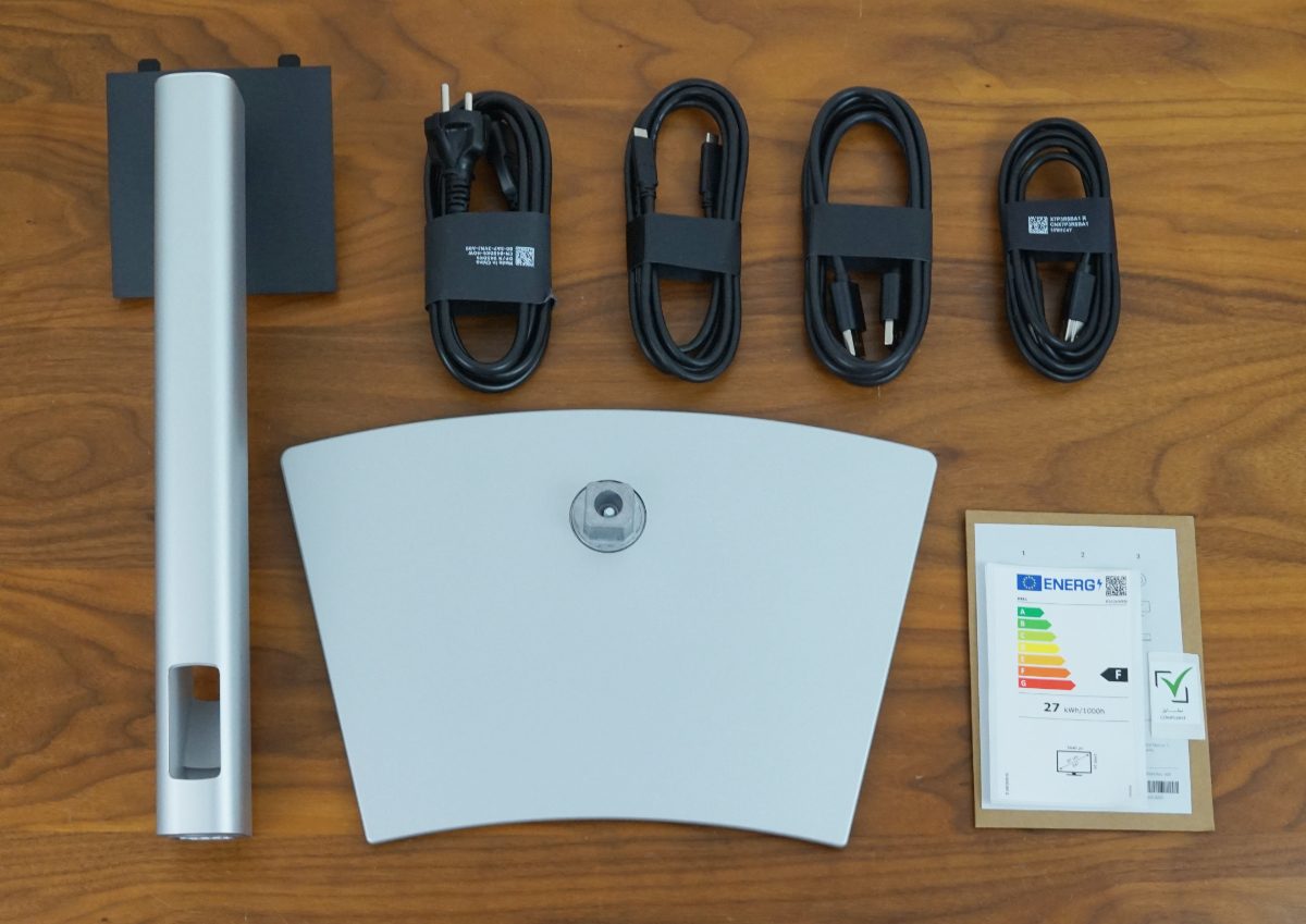 Neben dem Bildschirm selbst sind im Karton der Standfuß, das Standbein sowie Kabel für DisplayPort, USB-C, USB (B auf A) und Strom enthalten. Alle Kabel sind mit 180 cm Länge praxistauglich dimensioniert. Weiterhin liegen ein EU-Energielabel (Energieeffizienzklasse F), eine QR-Karte, Informationen zu Sicherheits- und Zulassungsbestimmungen, ein Compliant-Aufkleber und eine Broschüre mit Garantie- und Service-Informationen in Türkisch bei.