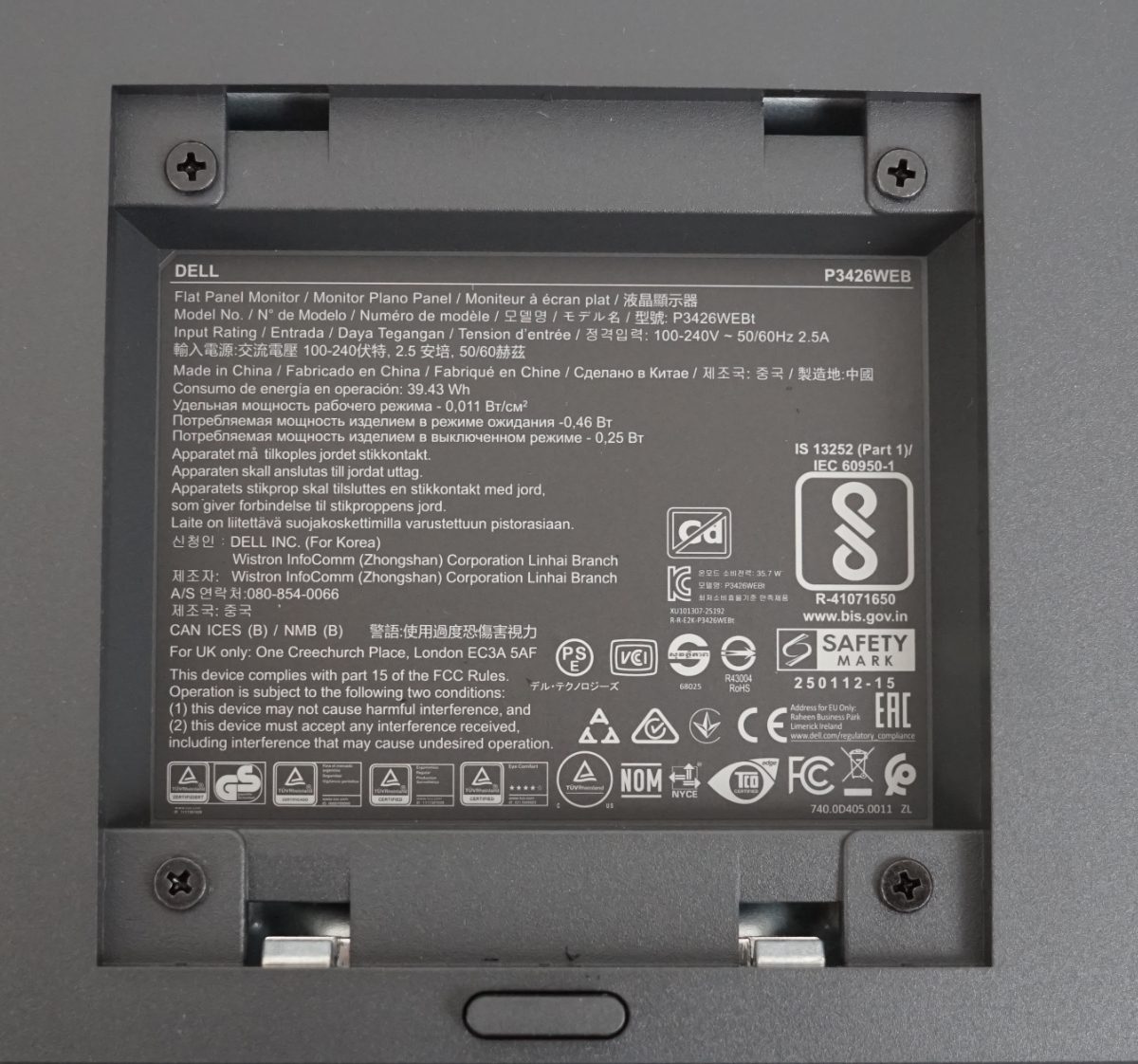 Dell nennt bei den Spezifikationen einen typischen Verbrauch von 27 Watt. Der Maximalbedarf beträgt nach unseren Messungen bei voller Helligkeit 40,1 Watt. Im ausgeschalteten Zustand über den Soft-off-Button liegt der Verbrauch schwankend zwischen 0 bis 0,34 Watt und im Stand-by-Modus schwankend bei 0,35 bis 0,66 Watt. Damit werden die EU-Richtlinien zumindest im Schnitt eingehalten. Einen Netzschalter, um den Monitor komplett vom Stromnetz zu trennen, besitzt der Dell P3426WEB nicht.