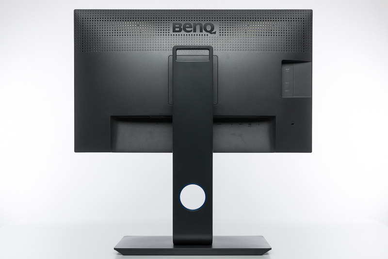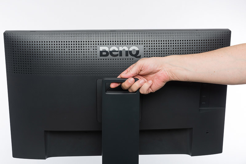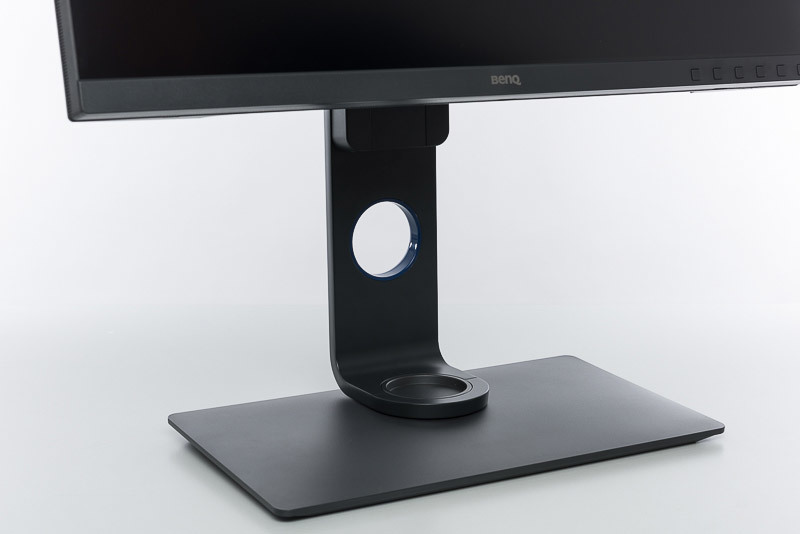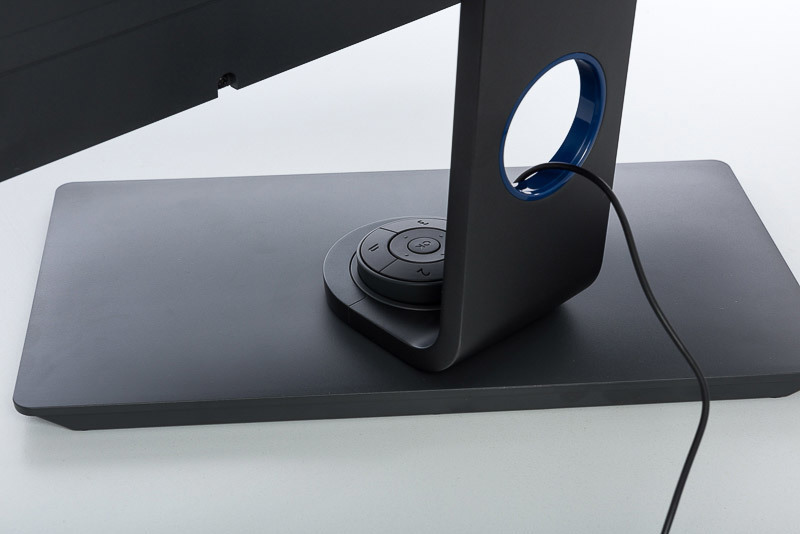 Zum Bündeln der Kabel hat das Standbein des BenQ SW271 eine runde, ausreichend große Öffnung. Die Mulde vorne dient zur Aufnahme des von BenQ „Hotkey-Puck“ getauften zusätzlichen OSD-Controllers.
