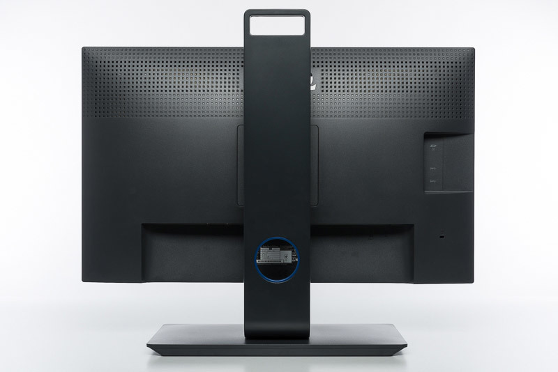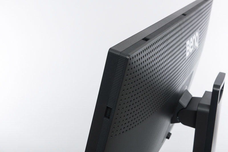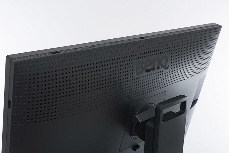 Das Netzteil ist beim BenQ SW271 in das Gehäuse integriert. Zur (rein passiven) Lüftung sind auf der Rückseite entsprechende Öffnungen vorhanden, die bei passendem Lichteinfall auch ein Stück weit den Blick in das Geräte-Innere zulassen. Eine Erwärmung konnten wir auch nach längerem Betrieb selbst in diesem Bereich nicht feststellen. Auf den Abbildungen unten sieht man auch gut die Öffnungen im Rahmen, die später der Befestigung der Lichtschutzblende dienen.