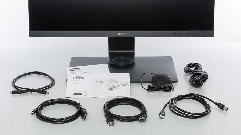 Beim Lieferumfang zeigt sich BenQ der Preis- und Geräteklasse entsprechend großzügig. Alle wichtigen Kabel (Strom, USB-Hub, DisplayPort, HDMI, USB-C) sind enthalten. Darüber hinaus sind auch wieder ein zusätzlicher OSD-Controller und eine Lichtschutzblende im Lieferumfang.