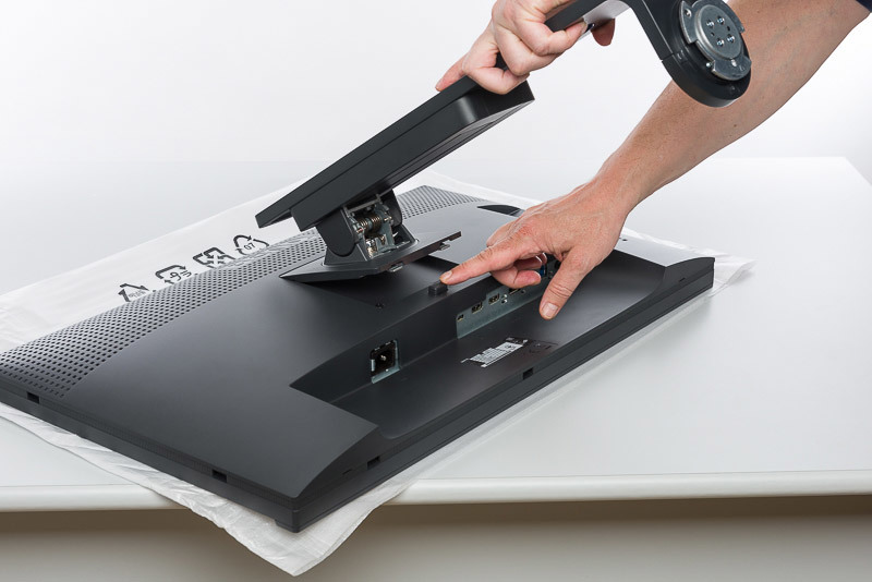 Die Montage des SW271 gestaltet sich wie bei anderen BenQ-Monitoren schnell und einfach. Das Standbein wird auf der Display-Rückseite eingerastet und kann per Knopfdruck wieder gelöst werden. Der Standfuß wird aufgesetzt, gegen den Uhrzeigersinn eingerastet und mit einer Flügelschraube fixiert. Im Handbuch wird allerdings – anders als hier abgebildet – empfohlen, erst den Standfuß auf das Standbein zu montieren und dann das fertig montierte Standbein auf der Rückseite einzurasten. Beides funktioniert.