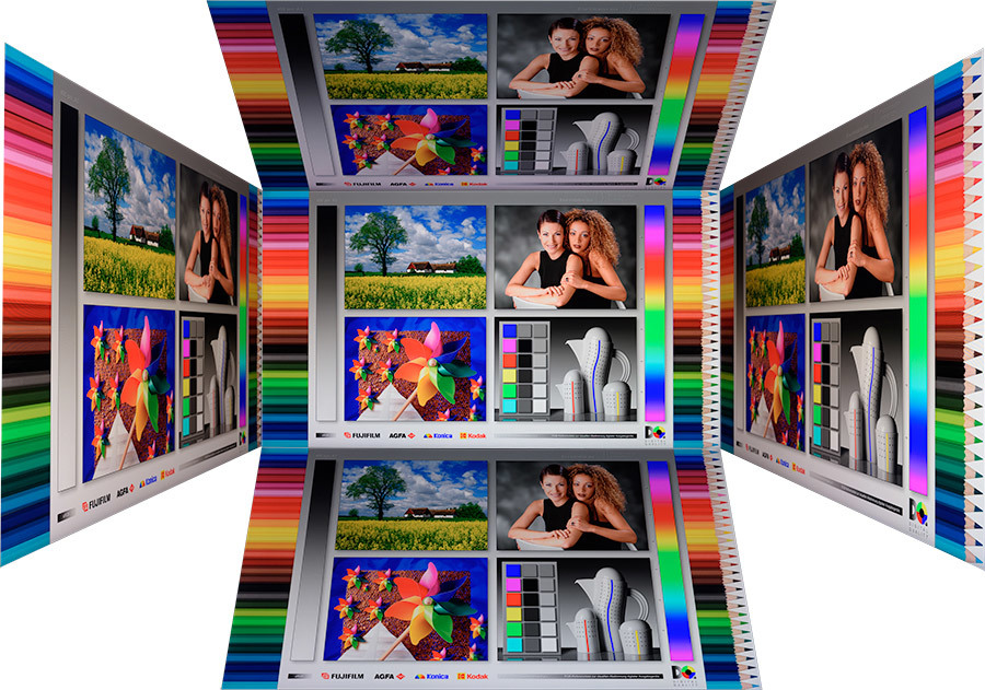 Auch bei extremeren Blickwinkeln bleiben die Farben dank des verbauten IPS-Panels sehr stabil. Wahrnehmbar sind vor allem die verminderte Helligkeit und eine etwas schlechtere Zeichnung in dunklen Bildbereichen. Bewegt man den Kopf seitlich bis an den rechten oder linken Bildschirmrand des riesigen Displays, ist die Zeichnung im schwarzen Rippen-Shirt der Damen auf der Abbildung noch zu erkennen. Geht man darüber hinaus, verschmilzt es zu einer schwarzen Fläche. Der Kontrasteindruck selbst leidet kaum.